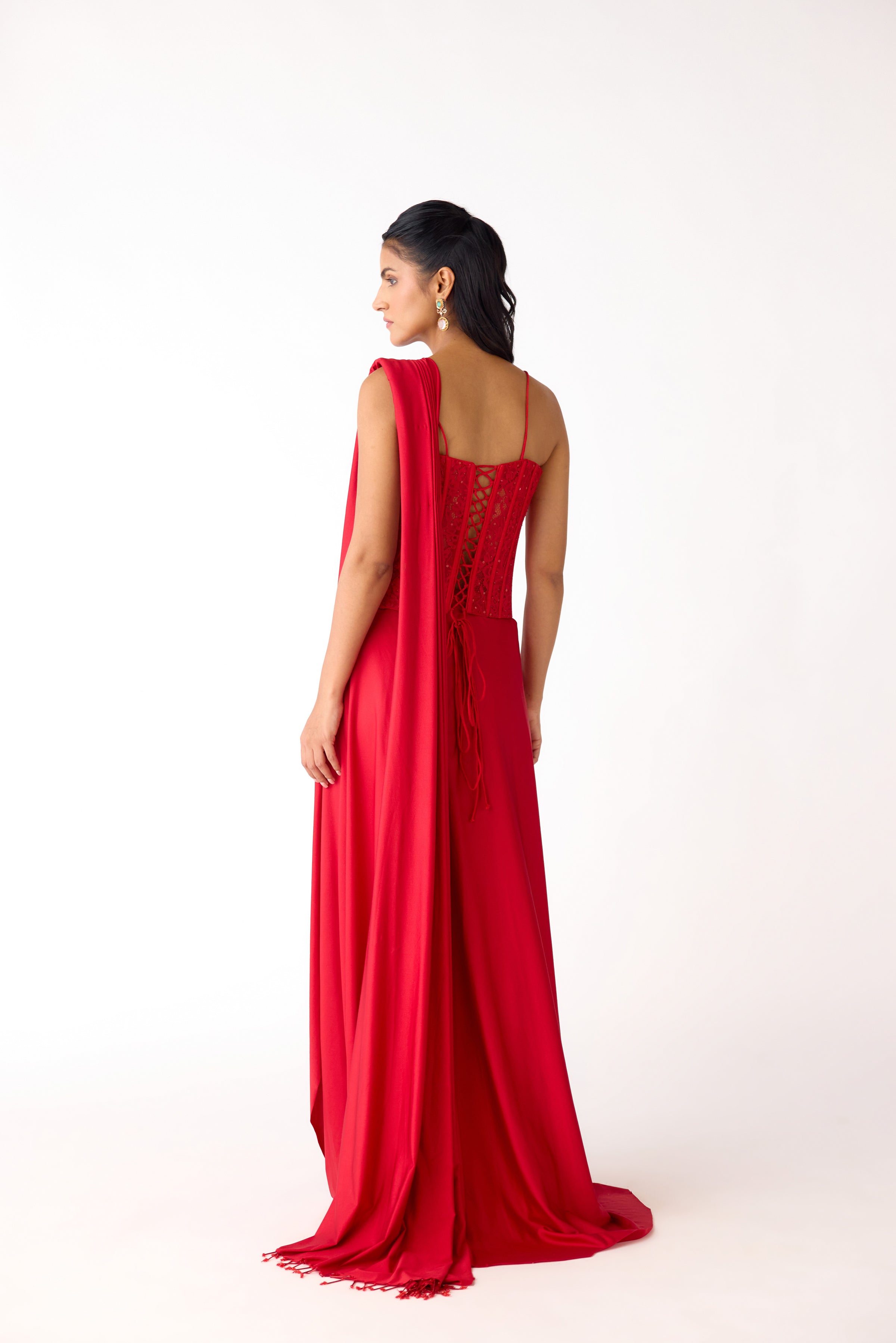 RED EMBROIDERED CORSET PRE DRAPED SAREE