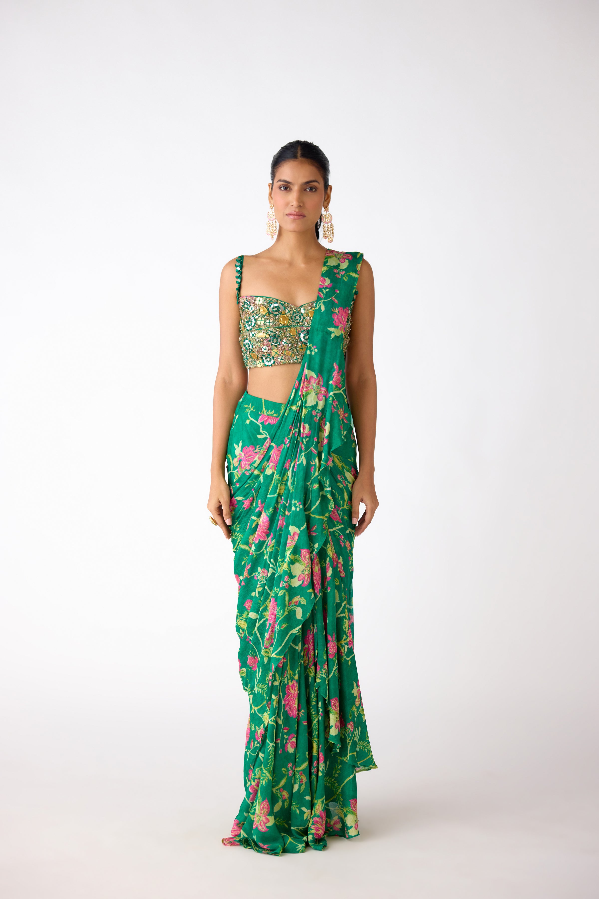 GREEN MIRROR EMBROIDERED PRE DRAPED SAREE