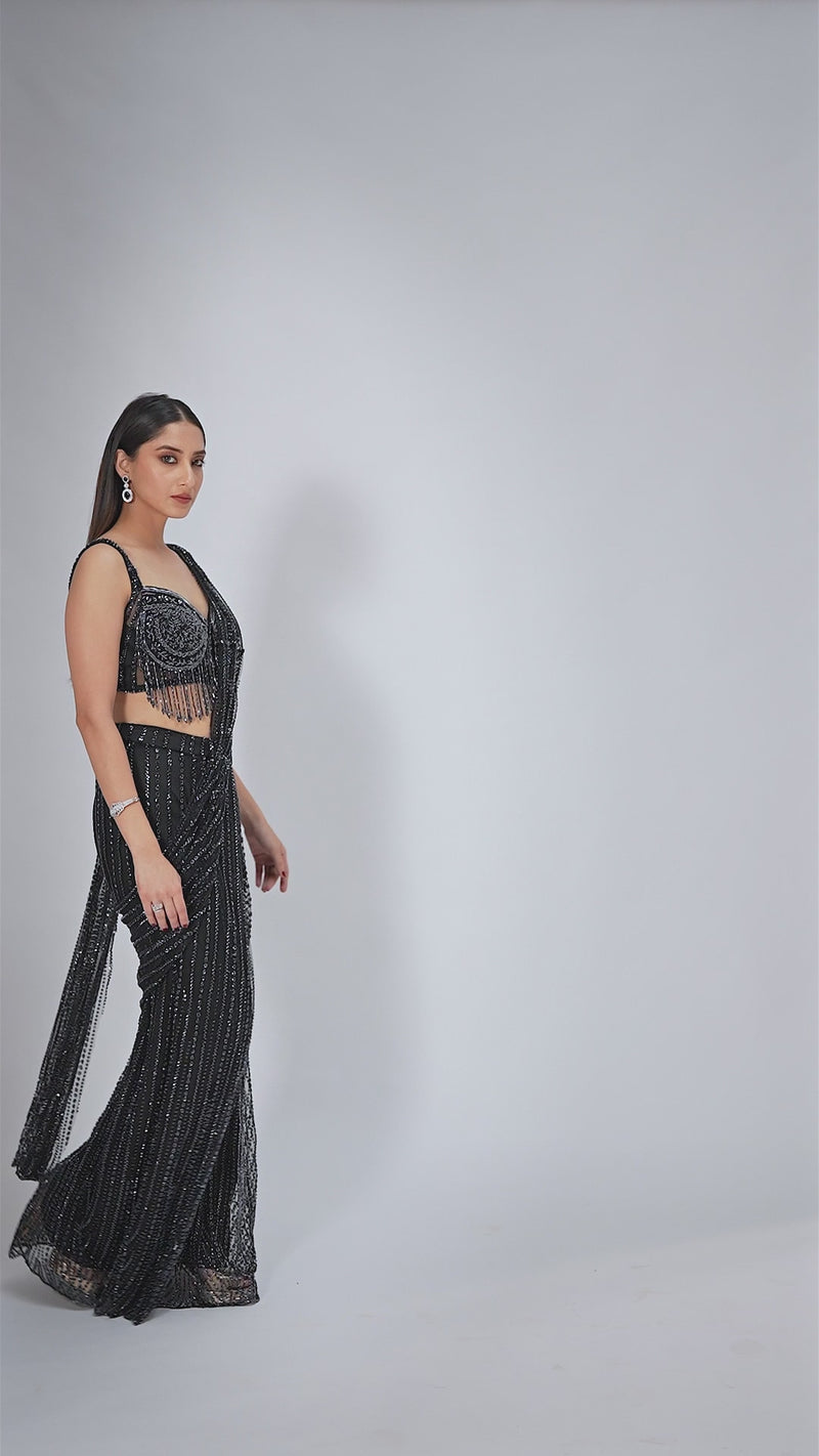 BLACK CRYSTAL EMBELLISHED BLOUSE AND PRE DRAPED SAREE SET