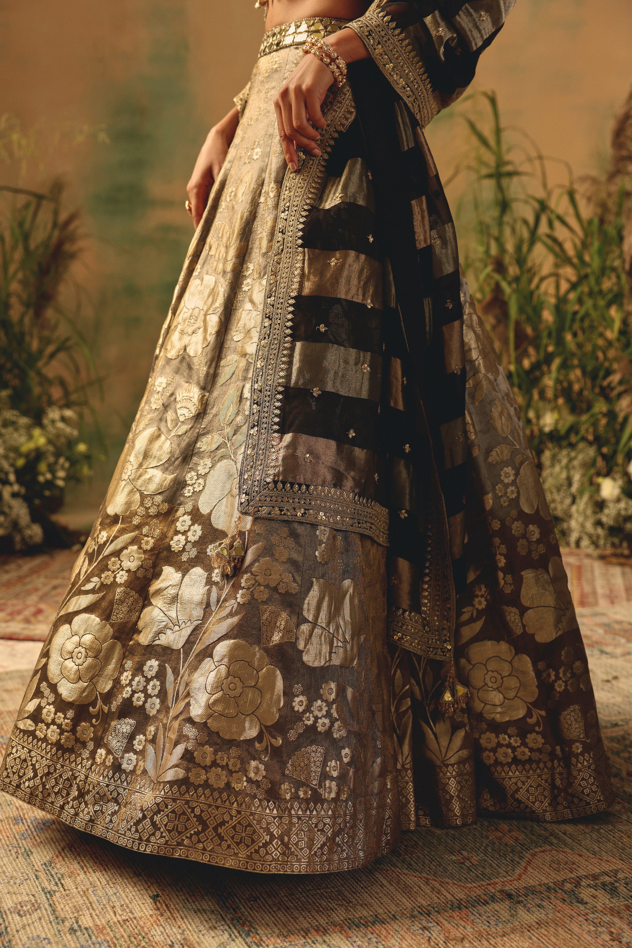 BROWN BANARASI MIRROR EMBROIDERED CORSET LEHENGA SET
